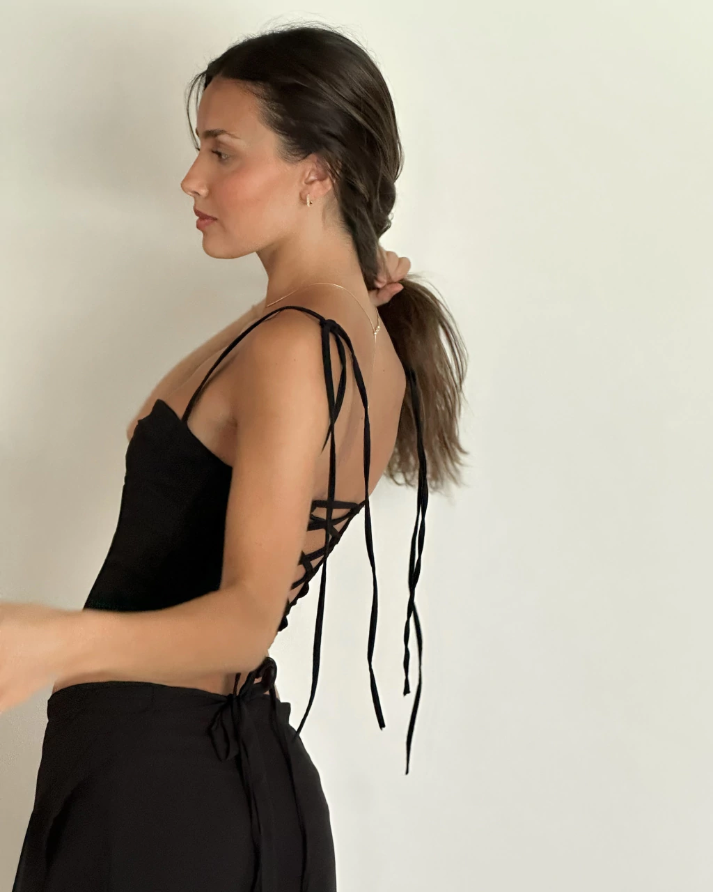 Confeccionada en crepé de gasa,un genero que le da una caída fluida y encantadora,esta pieza se caracteriza por sus volados al final de la misma,que aportan un delicado movimiento a cada paso.